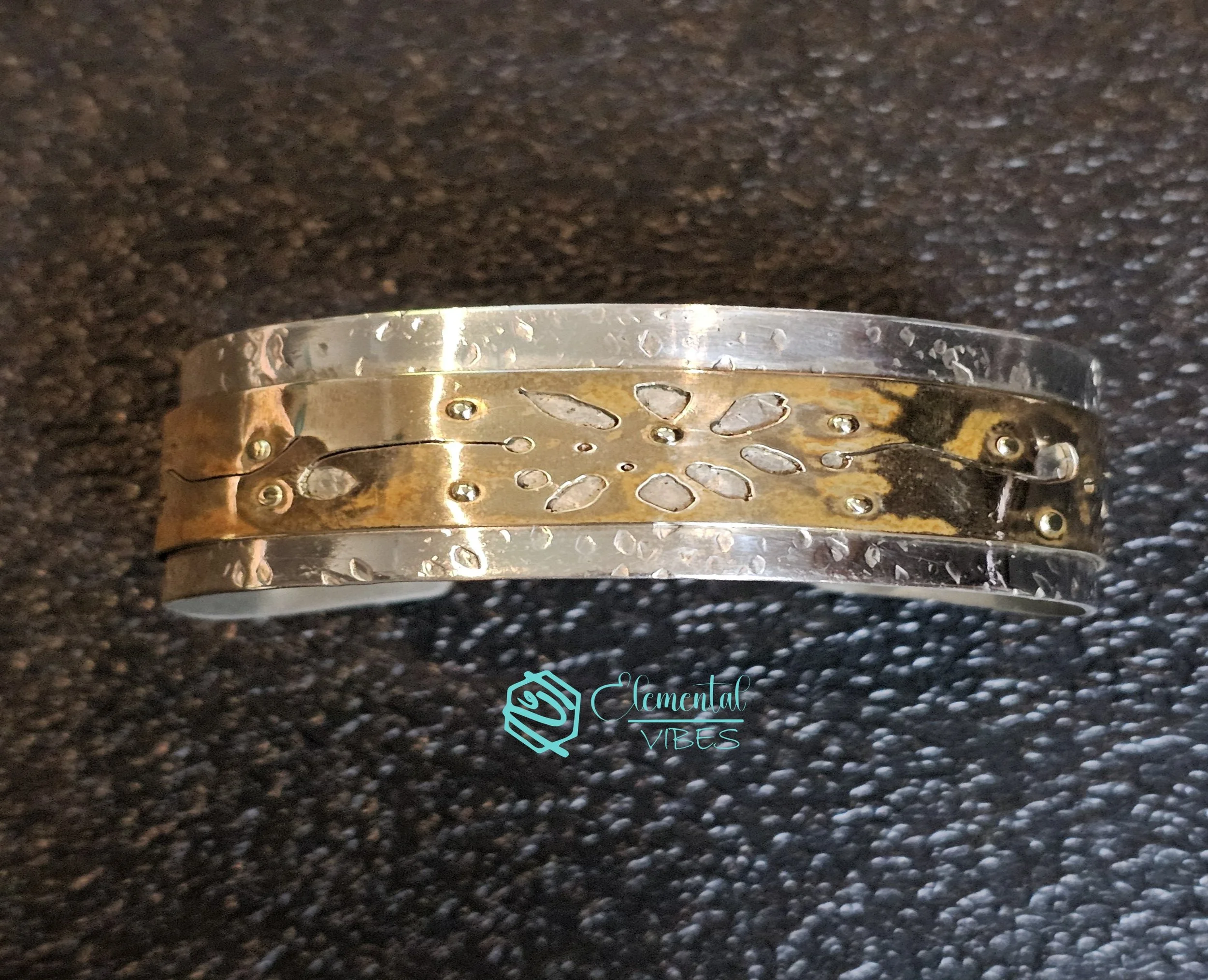 My partner and I signed up for Barb's class, and I made a cuff bracelet where I learned negative space cutting, riveting, texturing, and polishing metal. Meanwhile, my boyfriend made a ring, learning to texture and solder. His ring came out ridiculously well—no visible seams, which honestly impressed the heck out of me. Maybe I've created a monster (a very talented, supportive monster). Check out our SHOP page to see where we have put these skills to good use, like in our Pawsitive Vibes Necklace where I showed off my riveting skills.